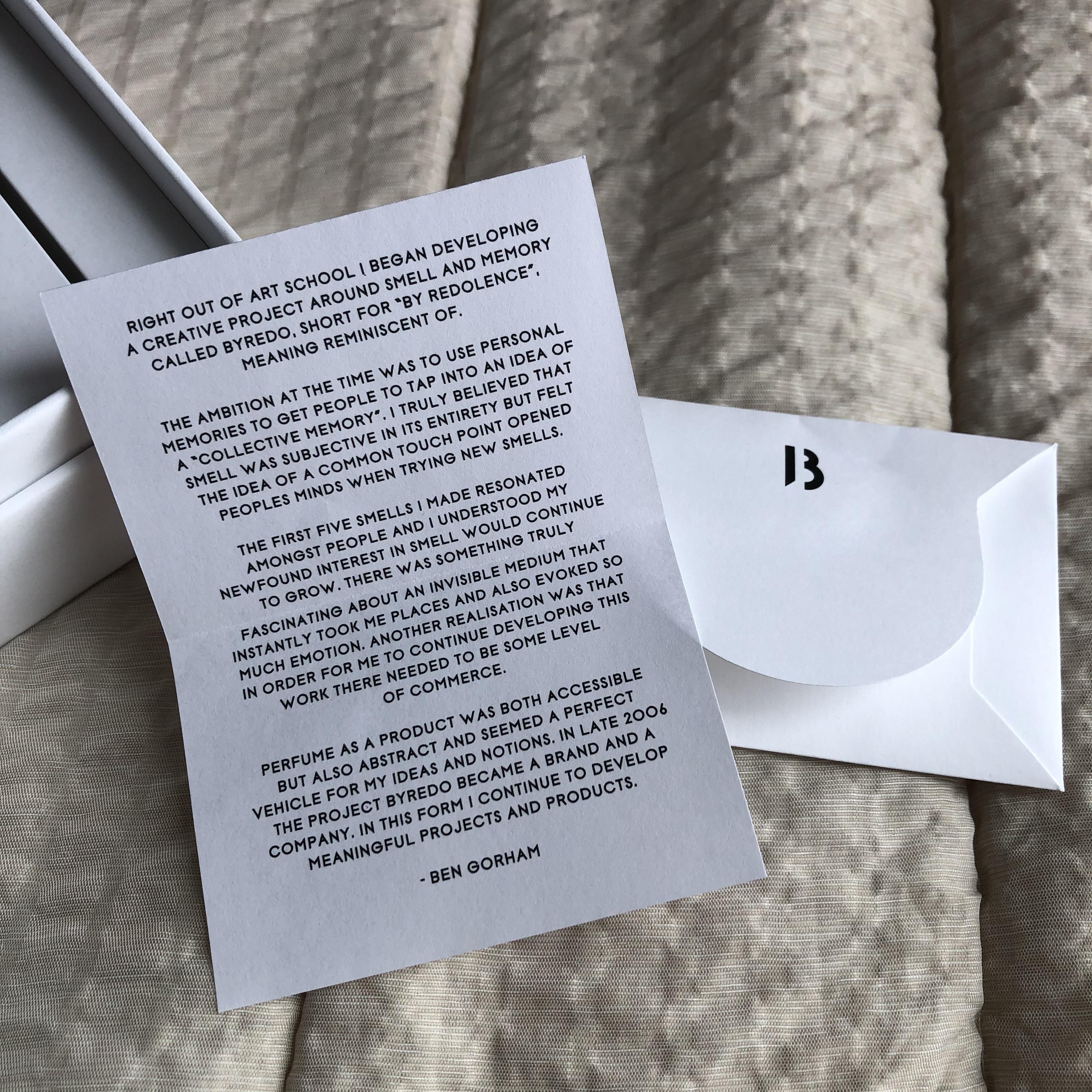 박스를 열면 향수 본품과 바이레도의 설립자인 Ben Gorham 의 편지가 담겨져있다