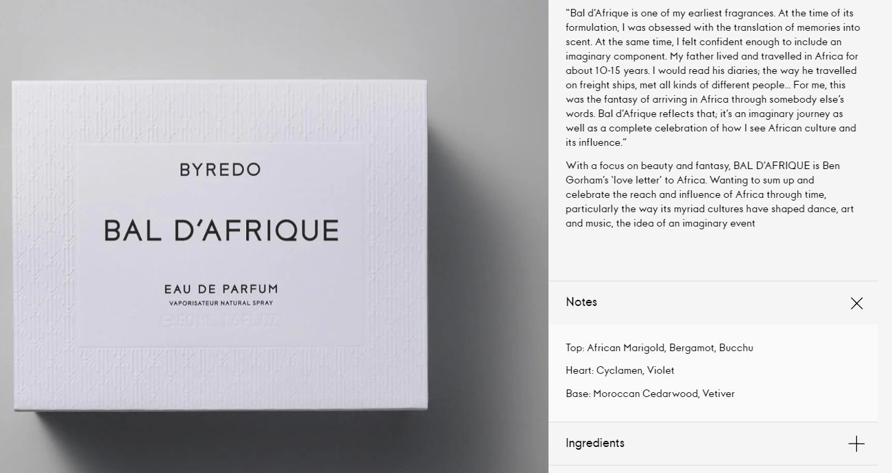 바이레도 공식 사이트의 발 다프리크 50ml 가격은 129유로로,